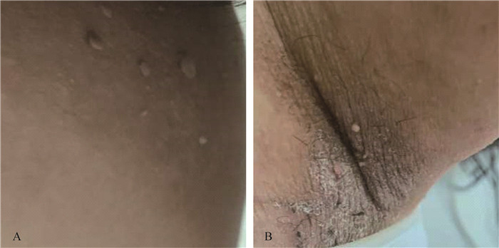 查体所示腹股沟区(A)及腋窝区(B)皮肤多发赘生物