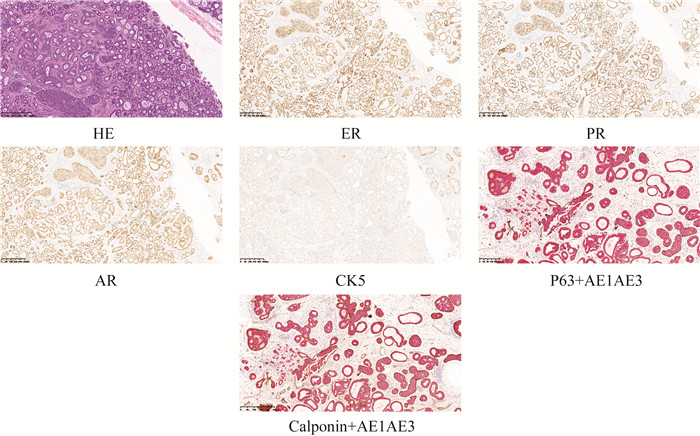 患者乳房肿块HE染色及免疫组化结果(×100)