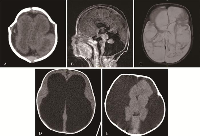 Fig 1 Imaging demonstrations of CNS malformations in the ≤ 1-year-old group A: CT revealed lissencephaly in a one-month-old infant; B: Dandy-walker malformation was found on sagittal MRI in a 1-month-old infant who died 3 months after birth; C: The cystic changes in bilateral cerebral parenchyma was found on MRI in a 2-month-old infant; D: The heavy hydrocephalus was found on CT in a 2-month-old infant who died after one-month treatment; E: The extent subdural effusion was found on CT for a 10-month-old infant who died one year after birth.