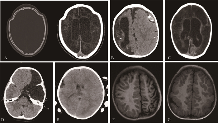 Fig 2 Imaging demonstrations of CNS malformations in the 1- to 3-year-old group and>3-year-old group A: The irregular contour of the cranium suggests craniosynostosis in a 24-month-old infant (left) and the relatively low density in both cerebral parenchyma was found(right); B: The dysplasia of gyrus in the right hemisphere and the corresponding porencephaly was found on CT image in a 24-month-old infant. The high-density hematoma was also found in the contralateral subdural space; C: The CT indicated the extent low density of both cerebral parenchyma in a 36-month-old infant. D: The absence of left frontal lobe in axial CT was found in a 48-month-old child. The subsequent follow-up demonstrated the barylalia with normal movement function; E: The giant gyrus in the right and the polygyria in left hemisphere on CT was found in a 60-month-old child. F: The dysplasia of left both frontal and parietal lobe was found on MRI in a 48-month-old infant. G: The polygyria was found in both the bilateral frontal and parietal lobe on axial MRI in a 48-month-old infant.