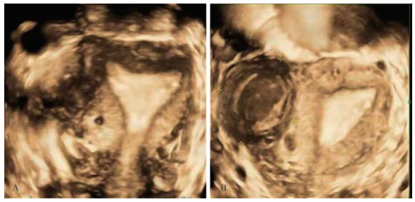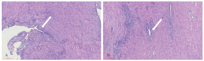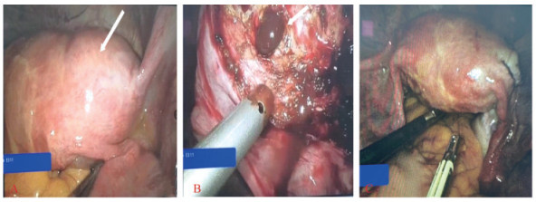 Fig 2 Results of laparoscopic examination A: The uterus was slightly full under laparoscopy, and no obvious abnormalities were observed. A mass with a diameter of 4 cm was visible onthe right anterior wall of the uterus, located below the anterior circular ligament of the right side, and no obvious abnormalities were observed inthe bilateral accessory area. The arrow indicates the position of the mass. B: In the process of removing the mass, the chocolate liquid was found toflow out. The arrow indicates the chocolate-like liquid. C: Uterine morphology was generally normal after operation.
