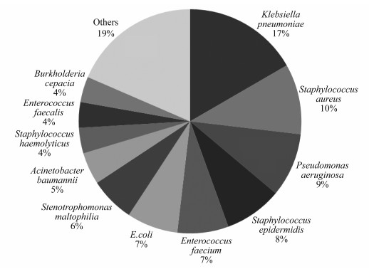 结果细菌分布 108株致病菌中革兰阴性(G-)菌67株, 占所有菌株的62.04%, 革兰阳性(G+)菌41株, 占37.96%。G+菌中, 葡萄球菌属26株, 占全部细菌的24.07%, 肠球菌属14株, 占12.96%。G-菌中肠杆菌科37株, 占全部细菌的34.26%, 非发酵菌30株, 占27.78%。单种细菌前6位的是肺炎克雷伯菌(18株, 16.67%)、金黄色葡萄球菌(11株, 10.19%)、铜绿假单胞菌(10株, 9.26%)、表皮葡萄球菌(9株, 8.33%)、屎肠杆菌(8株, 7.41%)和大肠埃希菌(8株, 7.41%)(图 1)。