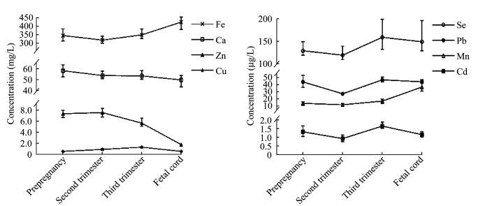 | The concentrations of elements were shown as Media (P25-P75). 图 1 妇女孕前至孕晚期全血及新生儿脐血元素浓度变化趋势 Fig 1 The element pattern in women's blood from preconception to the third trimester and fetal cord blood |