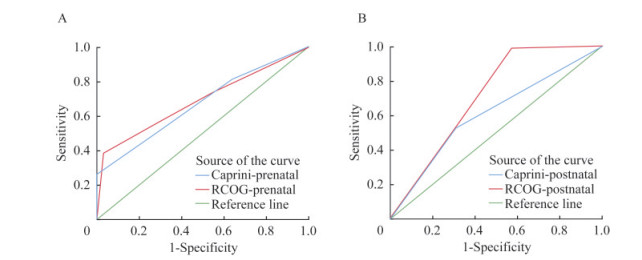 图 1 产前(A)、产后(B)两种模型的ROC曲线 Fig 1 ROC curve of the two models for prenatal (A) and postnatal (B) |